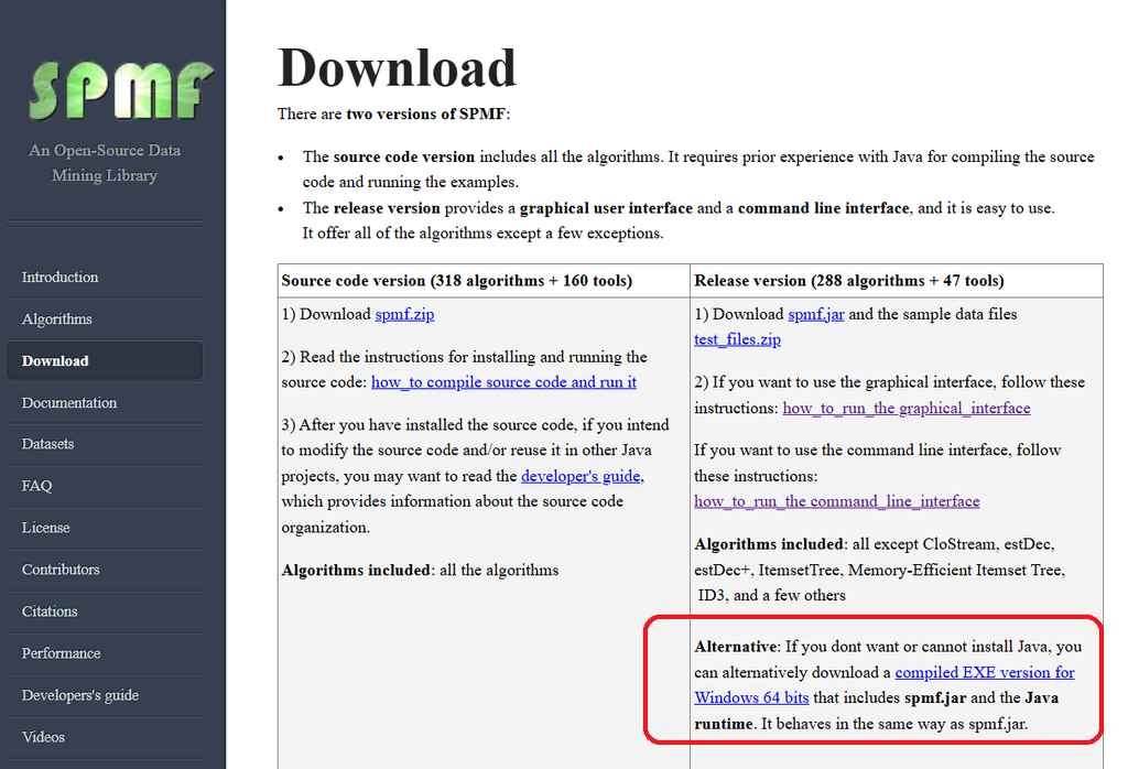Today, I want to announce that I have included a compiled EXE version of SPMF.jar for Windows 64 bits on the Download page of SPMF. It is especially useful if you cannot or do not want to install Java on a computer.