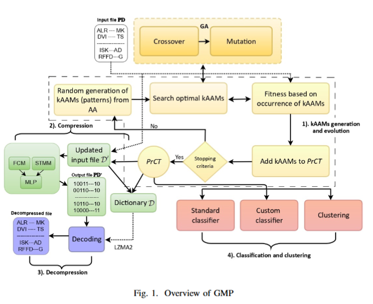 GMP was designed not only to compress protein sequences but also to provide insights into their structure through the discovery of meaningful subsequence patterns. By integrating MDL with a genetic algorithm, it strikes an effective balance between compression quality and interpretability. One of the unique strengths of GMP is that it can simultaneously serve multiple purposes: compression, classification, clustering, and pattern discovery—functions rarely combined in a single framework. Here is the main flowchart from the paper: