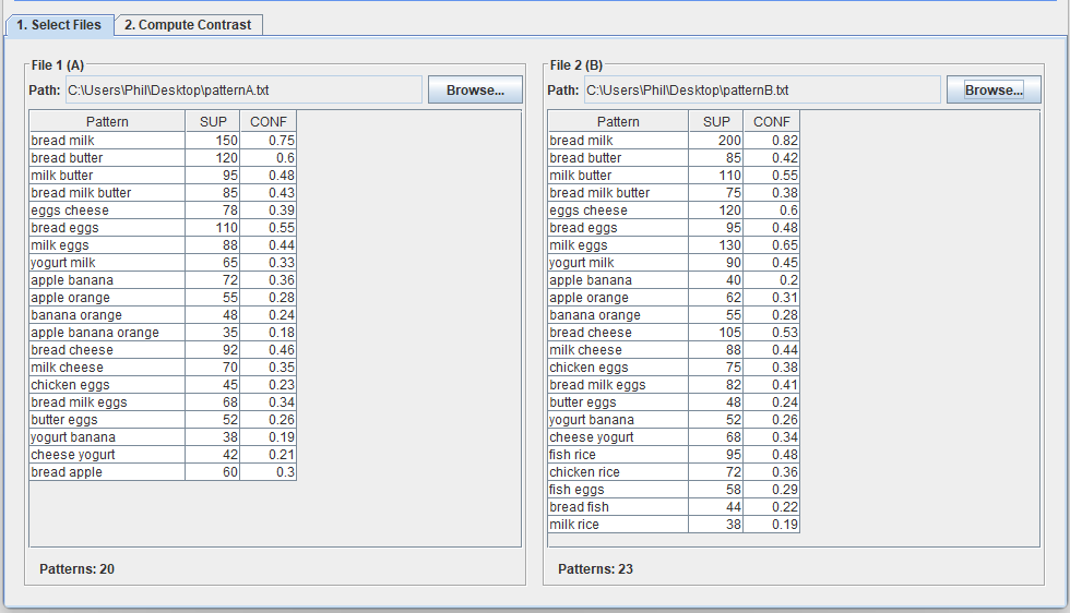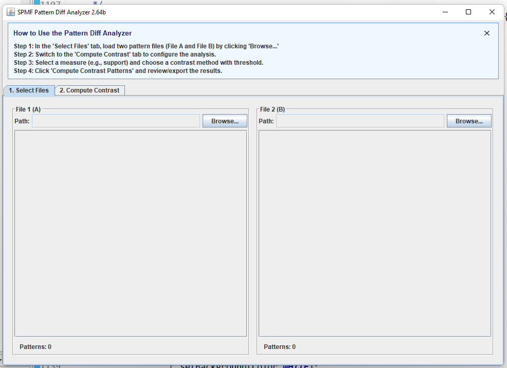 In this screen, we can select two files containing patterns found by a pattern mining algorithm. For example, I will use two files called patternsA.txt and patternsB.txt.