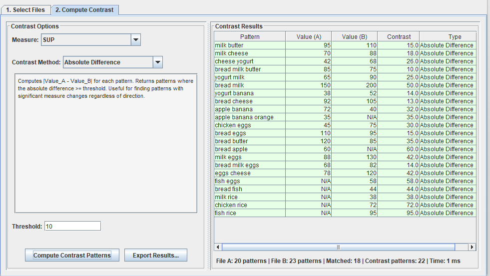 After that, we can go to the second tab called “Compute contrast” to find the differences in patterns between these two files. In the picture below, I choose the “SUP” measure (support) for calculating the difference, and I choose “Absolute difference” with the threshold of 10. This means that I want to find all the patterns where the difference in support is more than 10 between the two files. The result is 20 patterns: