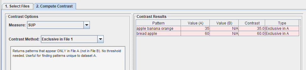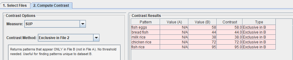 I can also choose other contrast methods such “Exclusive in file 1“, which means all patterns that only appear in the first file but not in the second file: